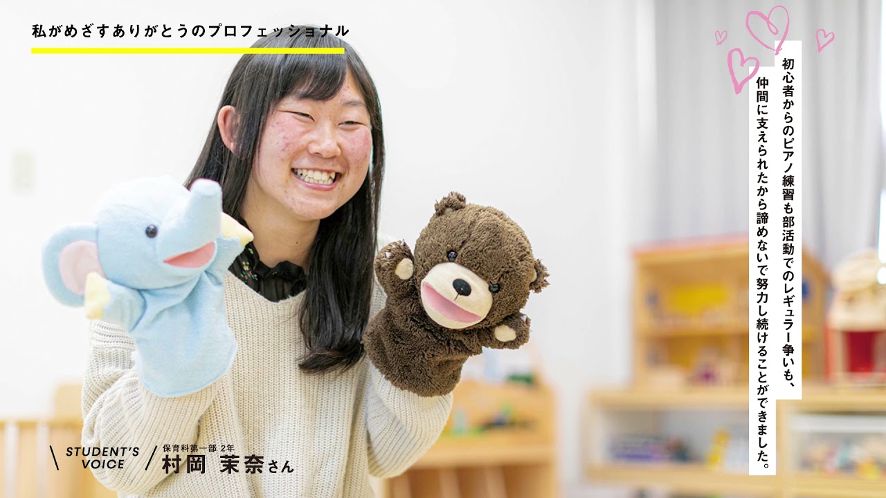 保育の学びでは、子どもと直接触れ合う中で得られるものが多くあります。キャンパス内に附属幼稚園があるので、実習はもちろん、それ以外の授業やボランティアなどを通じて在学中から子どもや現場の様子をより深く知ることができます。