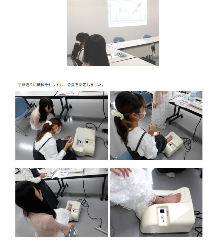 2年生科目のスポーツ・食育コース実践演習Ⅱでは、「骨の健康」について学び、骨粗しょう症の検査を行いました。