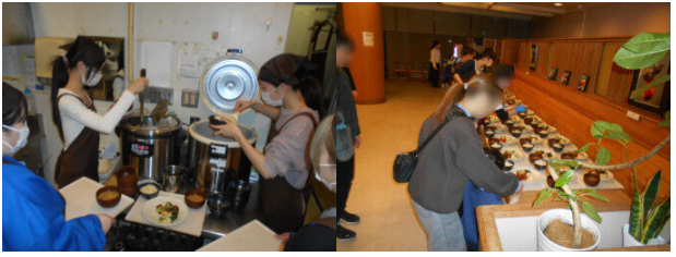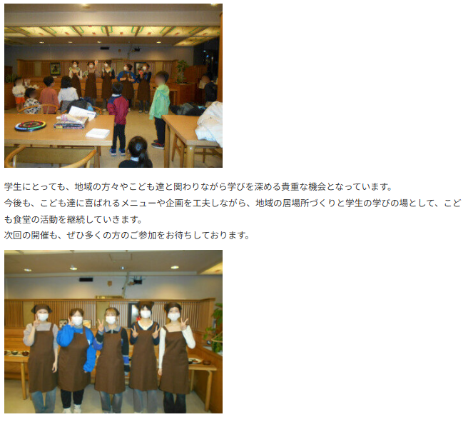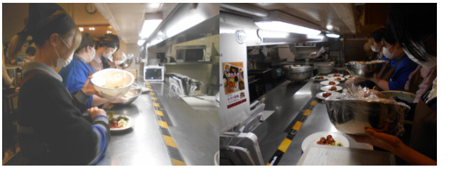 今回、ボランティアに初めて参加する学生もいましたが、経験者の学生がサポートをし、調理補助や盛り付け、配膳などを、みんなで協力しながらスムーズに作業を進めていました。こども達にも積極的に声をかけ、明るく対応する姿も多く見られました。
